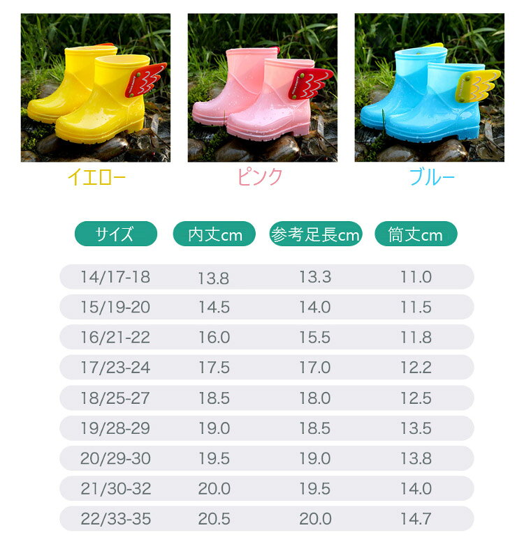 内容物:レインブーツ 素材:ラバー サイズ:13.8cm/14.5cm/16cm/17.5cm/18.5cm/19cm/19.5cm/20cm/20.5cm カラー:イエロー、ピンク、ブルー 注意事項 1商品写真はできる限り実物の色に近づけるよう加工しておりますが、 お客様のお使いのモニター設定、お部屋の照明等により実際の商品と色味が異なる場合がございます。